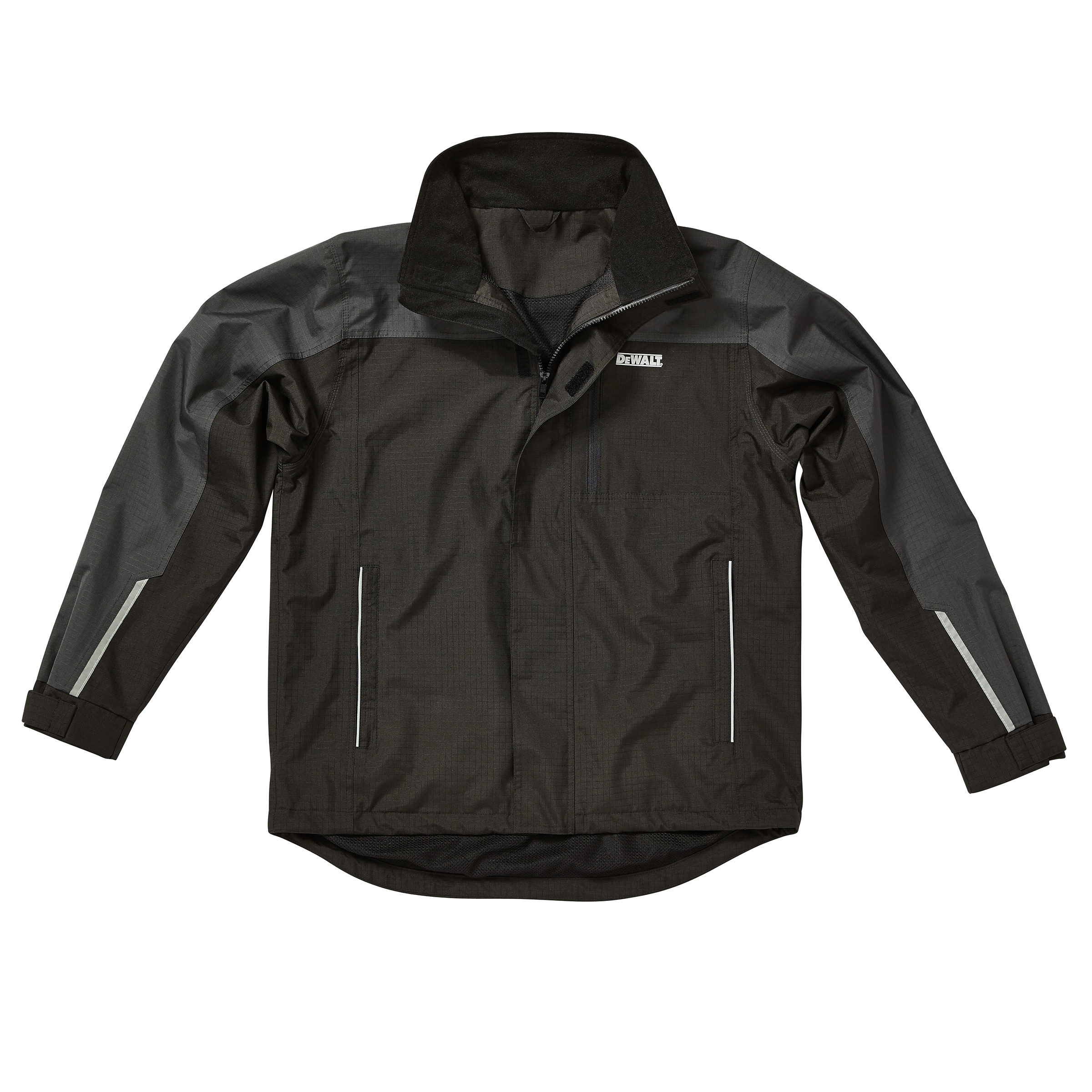 Grey/Black lightweight waterproof jacket. Concealed hood with toggle adjustment. Storm flap centre zip fastening. Lowered back and velcro adjustable cuffs. Vented back panel. Zipped pocket left breast and two hand pockets to lower front. Reflective piping detail to lower arms and pockets. A modern styled waterproof work jacket for all occasions.