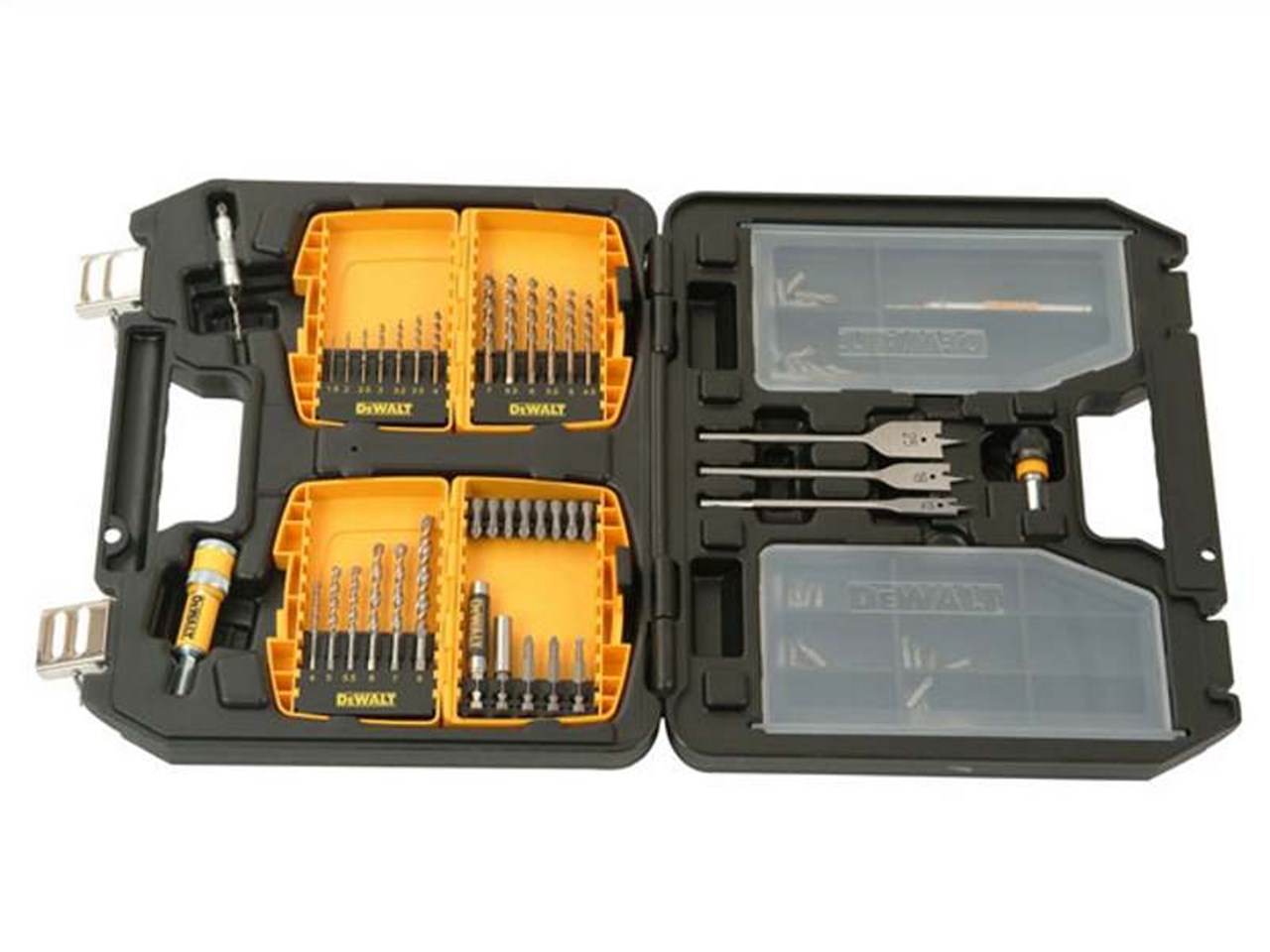 DeWALT 90 piece work site set in a robust plastic case with sturdy metal latches. The set contains an assortment of drill bits, flat bits and screwdriver bits.