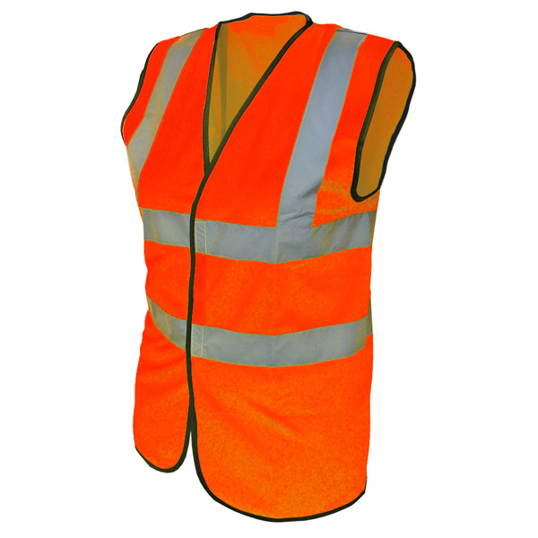 High visibility orange waistcoat with panels that reflect light to maximise visibility particularly during the hours of darkness.
