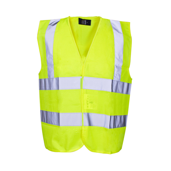 High visibility yellow waistcoat with panels that reflect light to maximise visibility particularly during the hours of darkness.
