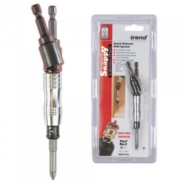 Use drill next to walls. Drills and fixes in tight spaces. Outer sleeve rotates allowing secure positioning. Shaft swivels to 20º angle. Accepts both insert bits and direct drive bits. Includes No.2 Pozi® 25mm insert bit.