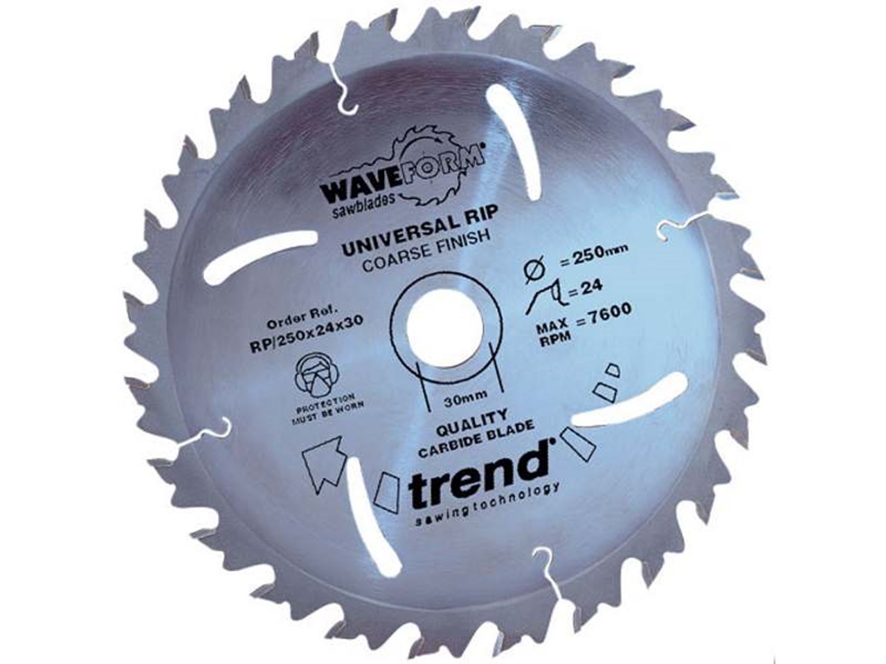 For ripping applications on saw benches for cutting along the grain. Chip limiter design for anti-kickback and cooling slots for continuous use.